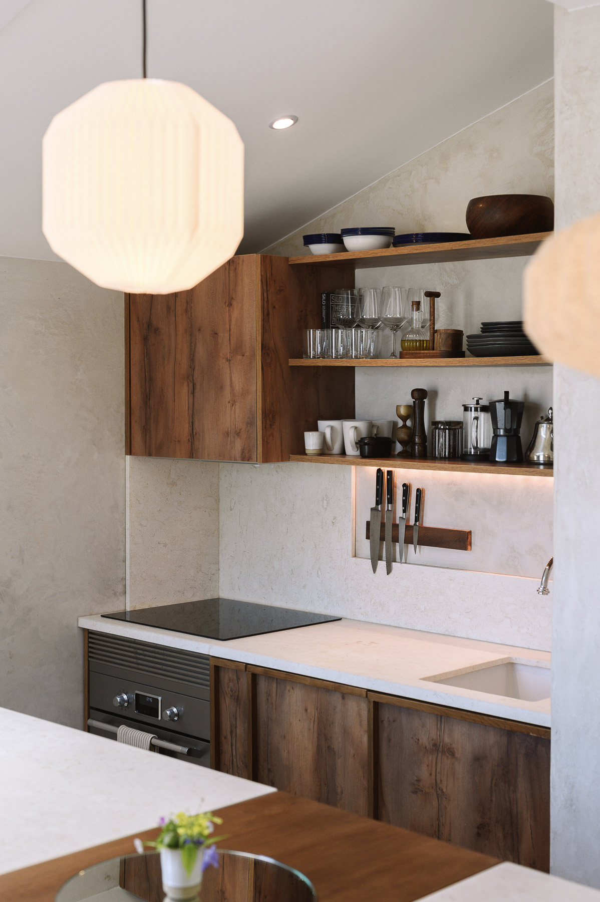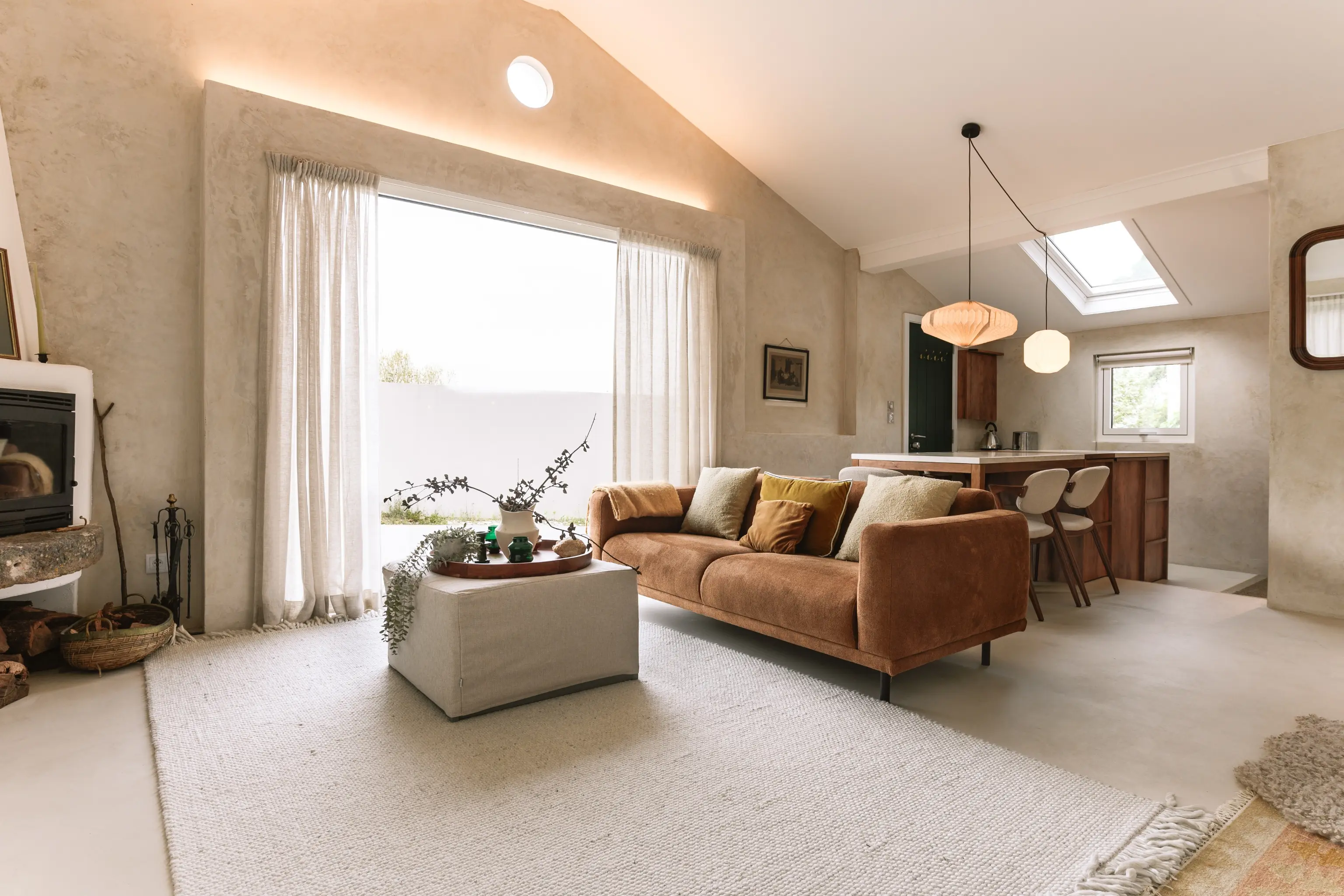 The layout was reconfigured into a single open-plan living and sleeping area, with a compact kitchen and bathroom optimised for function and flow. Large openings transformed what was once a dark interior into a bright, airy environment, drawing daylight deep into the space. Outside, a new retaining wall stabilises the slope, and the roof was completely rebuilt to align with the redesigned structure.
