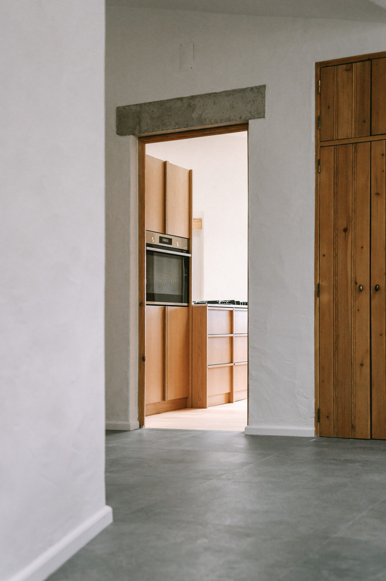 All internal finishes were replaced or restored. Underfloor heating was installed through the living spaces, bathrooms, and hallways for energy efficiency and comfort. Throughout the main rooms, new wood flooring was laid in continuous 11.5-metre planks, a design choice that required precise planning and careful handling on site. The bedrooms, bathrooms, and basement were all finished in microcement for a seamless yet durable surface.