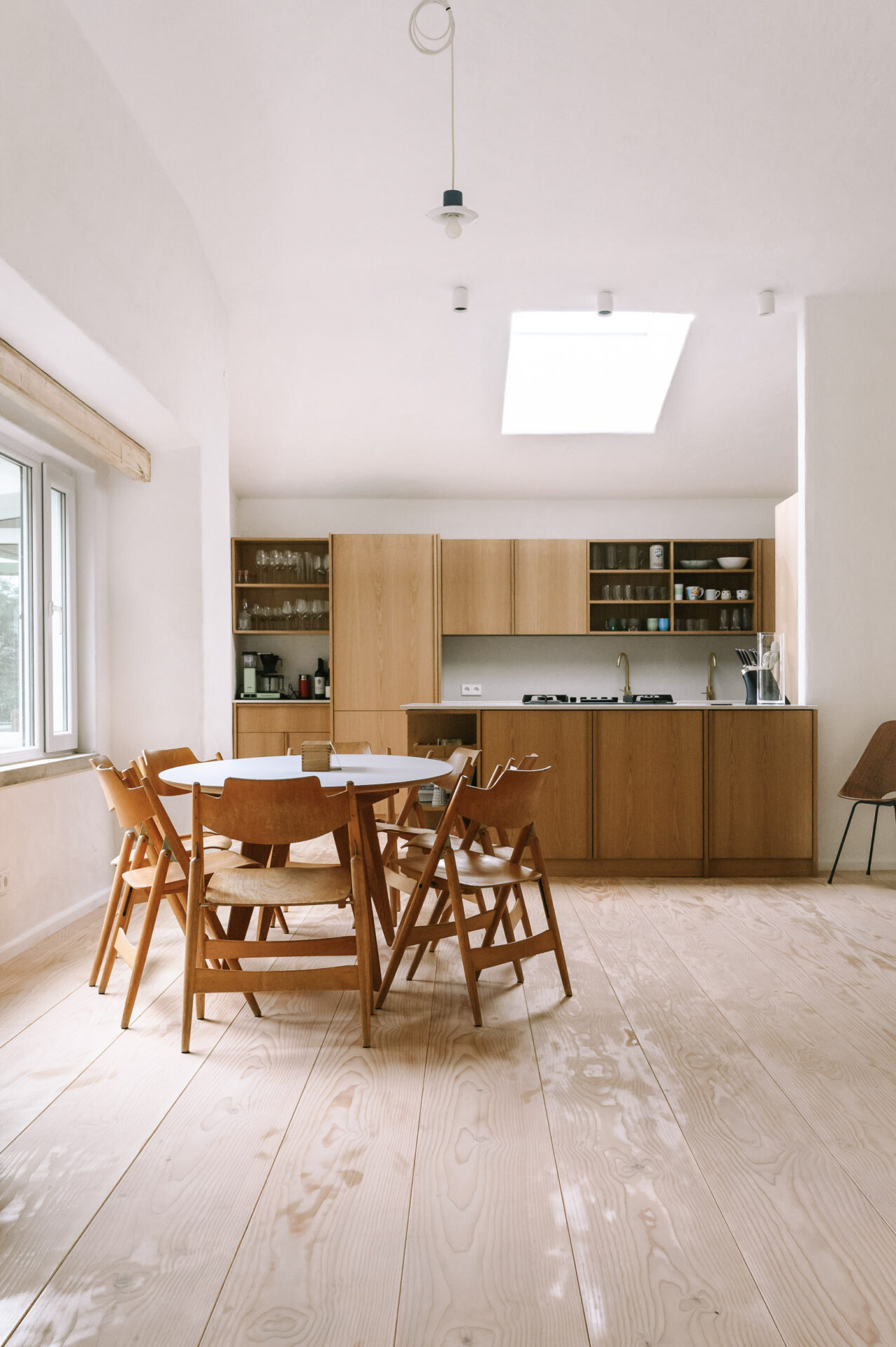 LandingPad’s primary intervention was structural: the partial demolition of a wall separating the kitchen and living room to create an open connection between the spaces while maintaining the building’s structural integrity. A skylight was added over the kitchen workstation, dramatically improving the natural light in the center of the house.